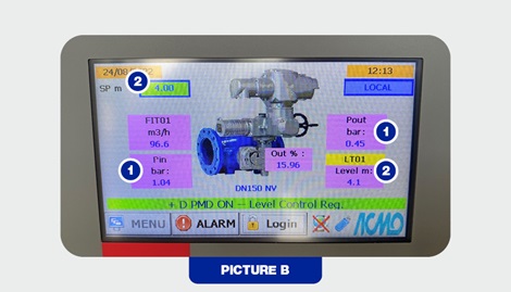 2. The top left green box indicates the set point for the reservoir. The control will tell the valve to start to close. Pictured bottom right, there is a reading of 4.1 metres, very close to the customer’s preference. The valve then receives a signal to modulate to the close position to decrease the level within the reservoir.